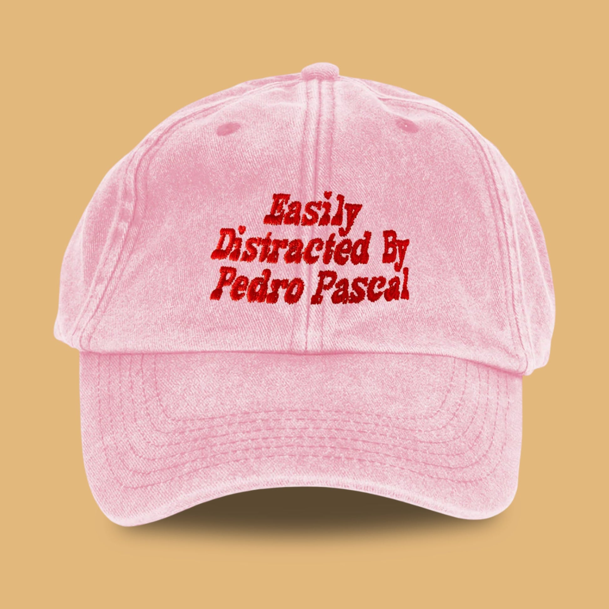 The "Easily Distracted by Pedro Pascal" hat is more than just a fashion accessory – it's a witty and genuine statement from a true Pedro Pascal fan! With white lettering painted on a grey denim background, this design shows off your unabashed love for the charming.
