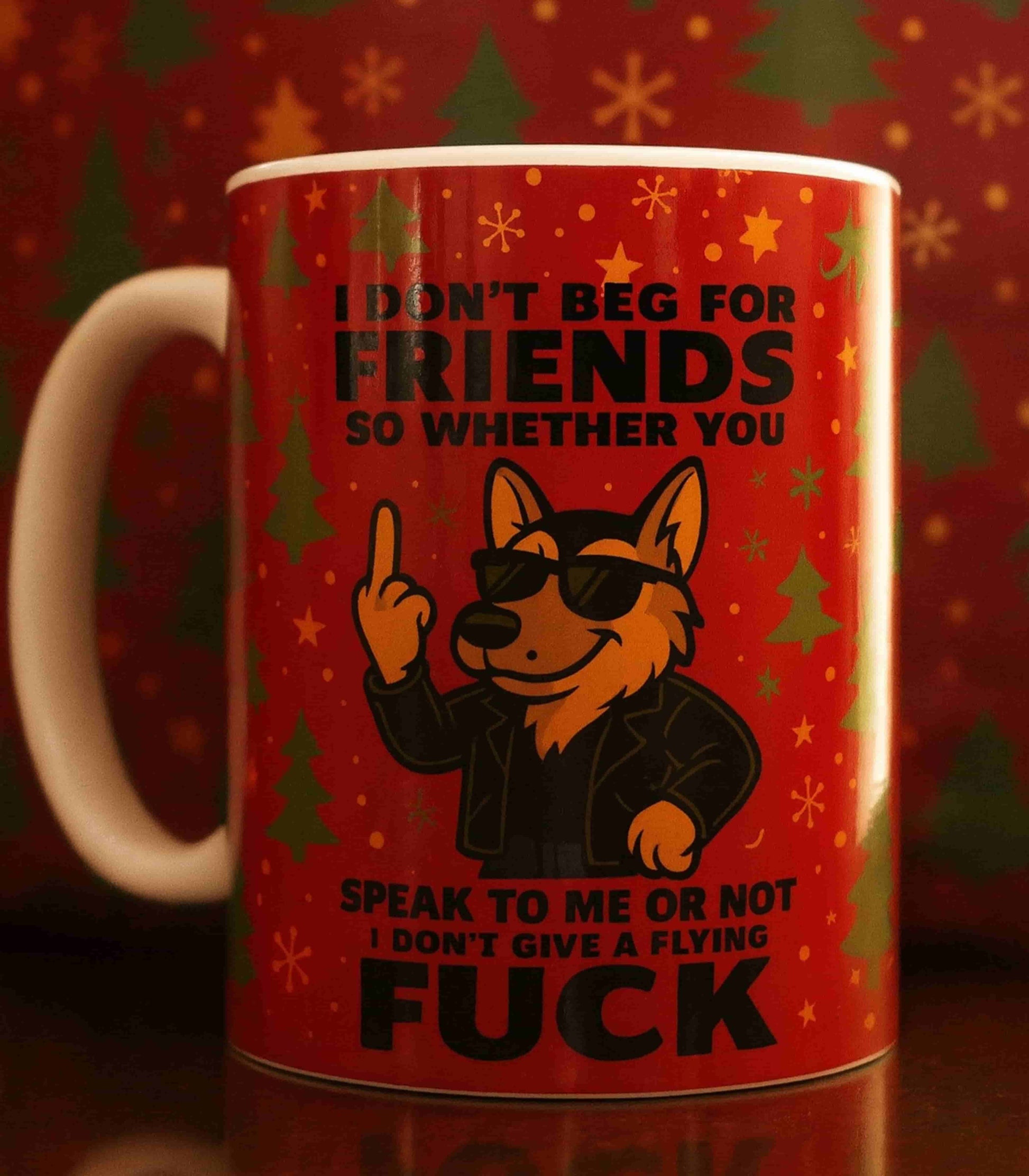 The I Don't Beg For Friends Mug is straightforward, strong and humorous, for those who live true to their personality. Design of a furry dog wearing a leather jacket, wearing black glasses with a personality-filled caption: