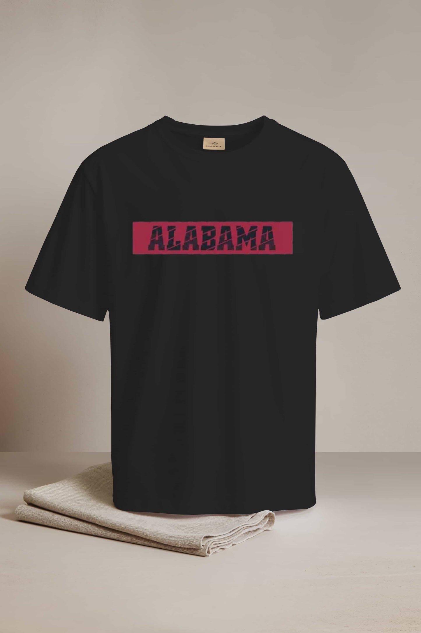 On a deep black fabric, the red “ALABAMA” lettering stands out in a rectangular frame, creating a strong emphasis on the quiet confidence and undying power of the Crimson Tide. The subtle contrast between red and black gives the shirt a modern, fashionable, yet sporty look.